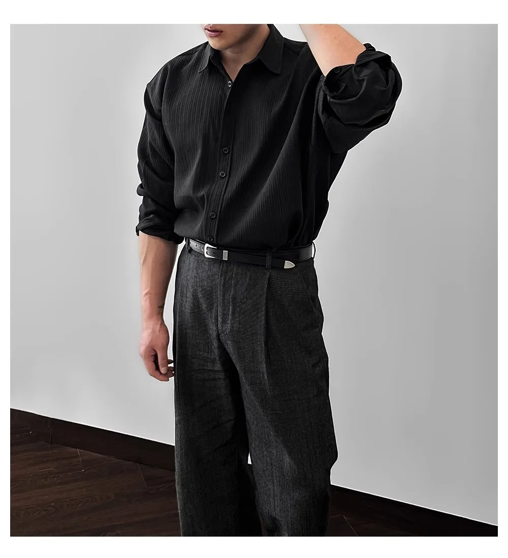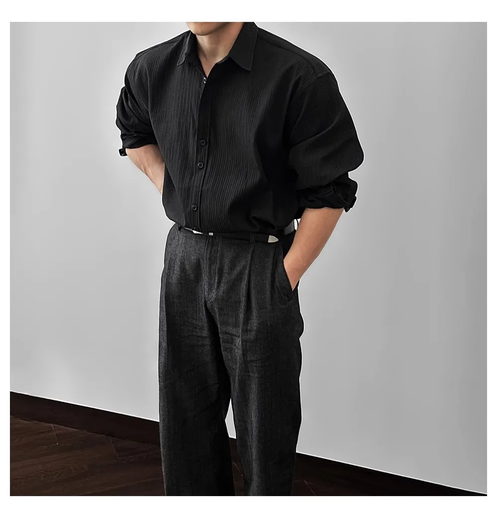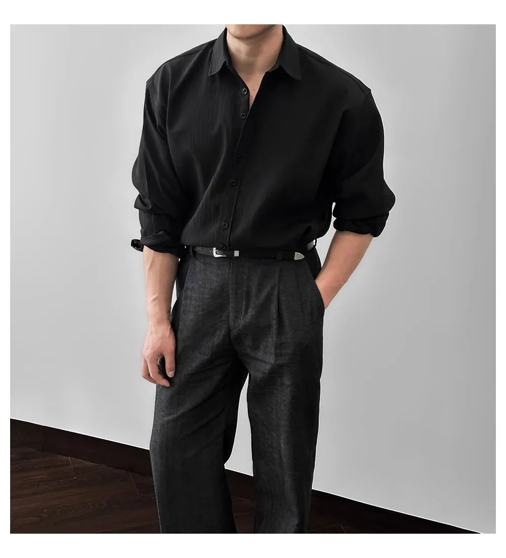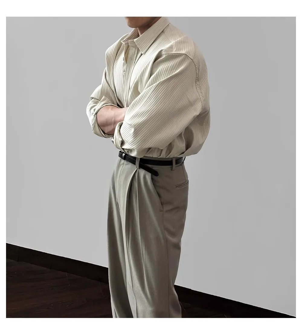 Spring Autumn Long-sleeved Shirts for Men American Fashion Vertical Stripe Texture Solid Color Loose Iron-free Tops